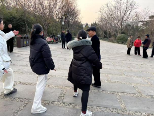 在英雄山公园,团队与太极爱好者共同打太极,体验传统运动的魅力。(下图为团队成员练习太极和与太极爱好者的合影)