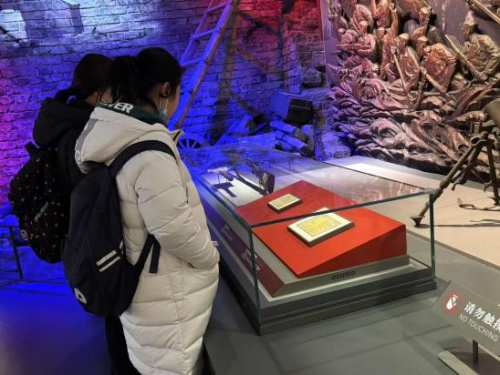 在情景还原的“秘密印刷所”前,泛着墨香的纸张上,《共产党宣言》中“全世界无产者联合起来”的字样略显模糊却力透纸背。队员感叹道:“这种沉浸式体验让我们触摸到先驱者如何在黑暗中擎起火炬。”(下图为队员参观纪念馆中的展品的照片以及在馆前的合影)